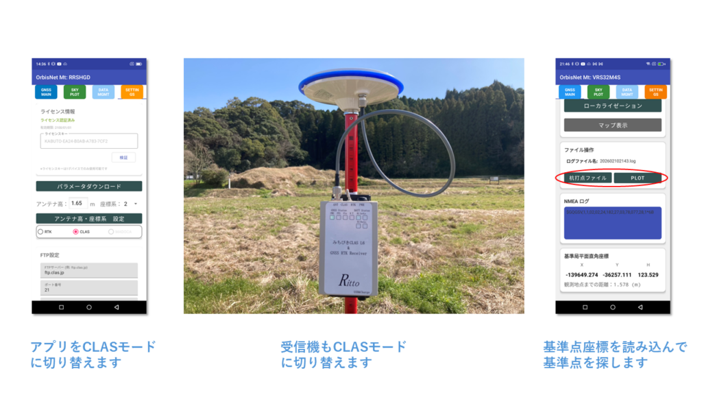 2級基準点上で、CLAS と RTK の観測を行いました。RTKは docomo IoT高精度GNSS位置情報サービスを利用しました。その結果、