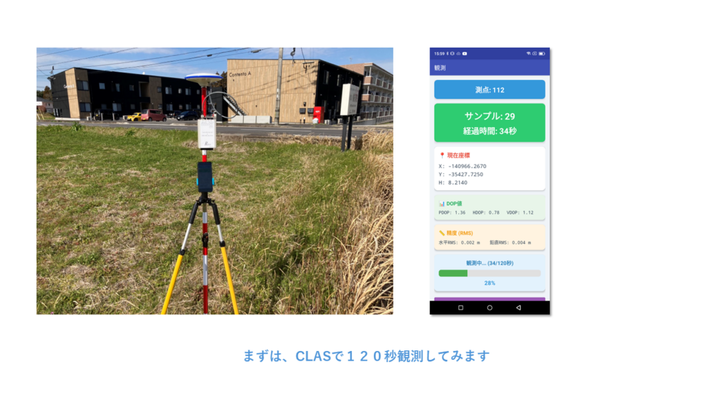 CLASのY座標のズレ(0.131m)が目立ちますが、CLAS(SSR方式)は収束までに時間がかかる特性や、放送暦の誤差が数センチ〜十数センチ乗ることが一般的です。公共測量の2級基準点(許容誤差:水平約2cm以内)と比較すると、CLASは「単独で基準点測量に使う」というよりは「手軽に概略位置を知る」用途に向いていることが数値からも裏付けられています。