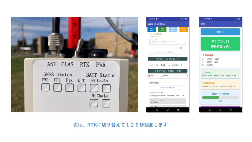 RTK(NTT)水平RMS 6mmという数値は、公共測量における「1級・2級基準点」の観測においても非常に優秀なスタティック観測に近い信頼度が出ています。
