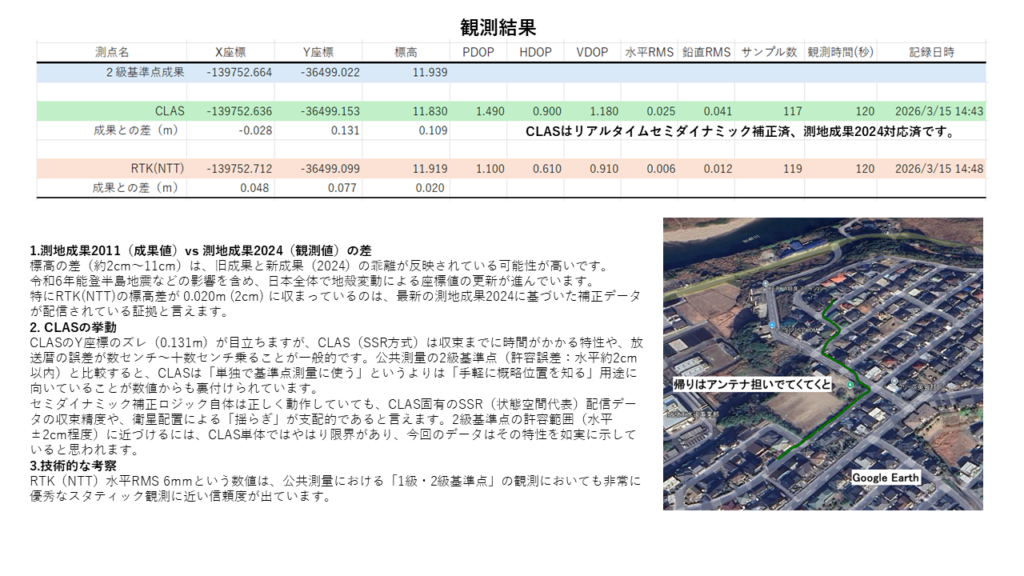 セミダイナミック補正ロジック自体は正しく動作していても、CLAS固有のSSR(状態空間代表)配信データの収束精度や、衛星配置による「揺らぎ」が支配的であると言えます。2級基準点の許容範囲(水平±2cm程度)に近づけるには、CLAS単体ではやはり限界があり、今回のデータはその特性を如実に示していると思われます。