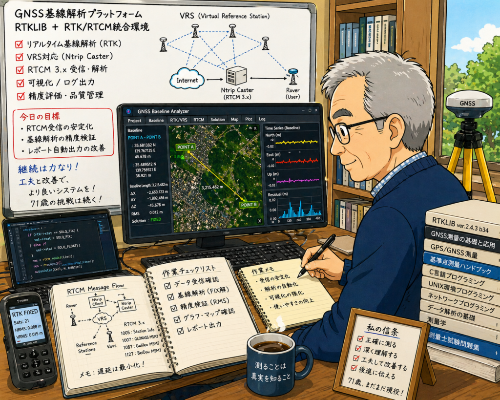 GNSS基線解析のRTKLIBとVRS環境を操り、リアルタイム基線解析に励み、精度の向上と報告の自動化を日々工夫するその姿、かっこいい~(^^)